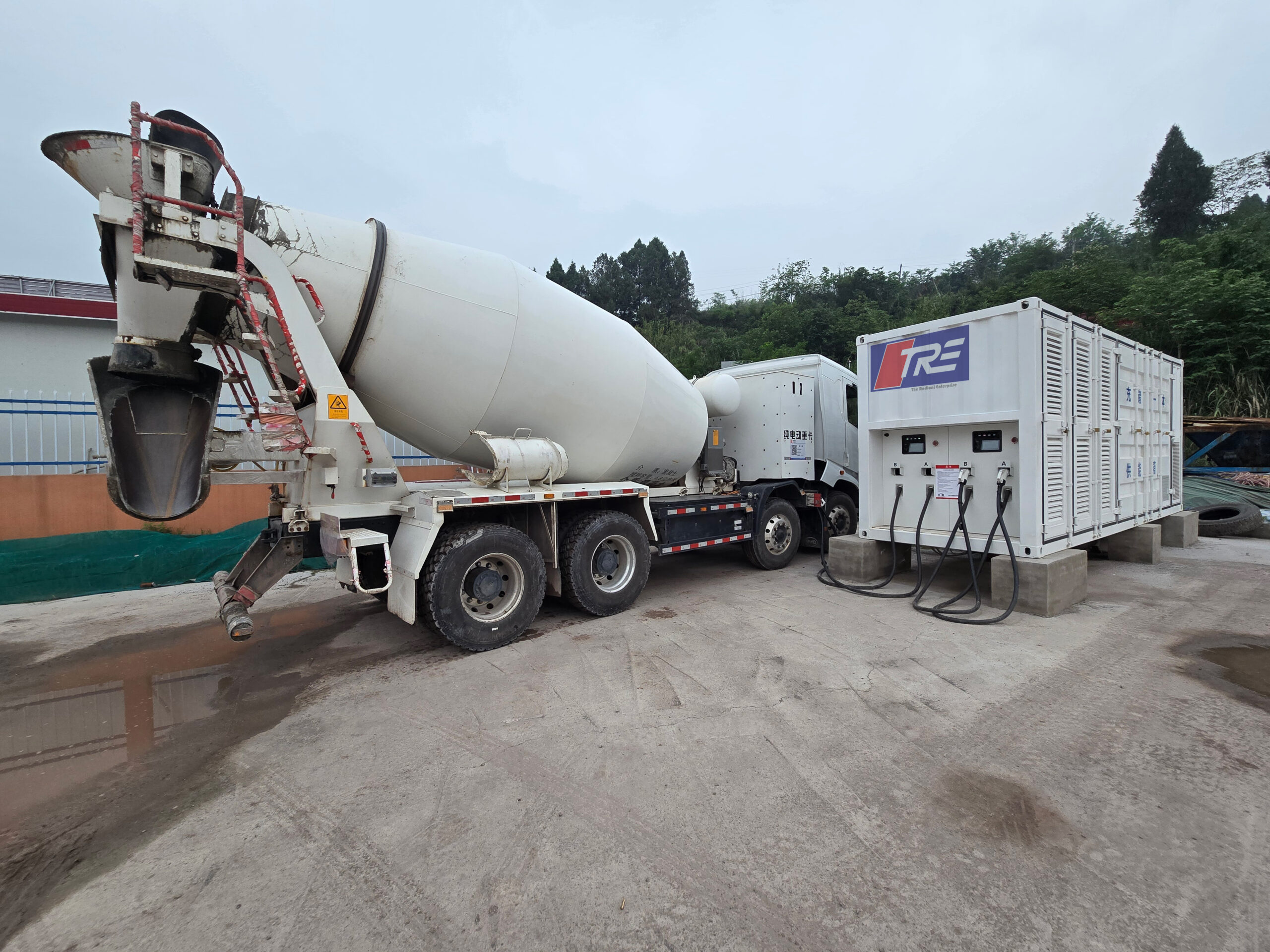 High power EV cement truck of 400kWh batteries charged with Container Energy Storage System with integrated chargers of 360KW using dual pistols.